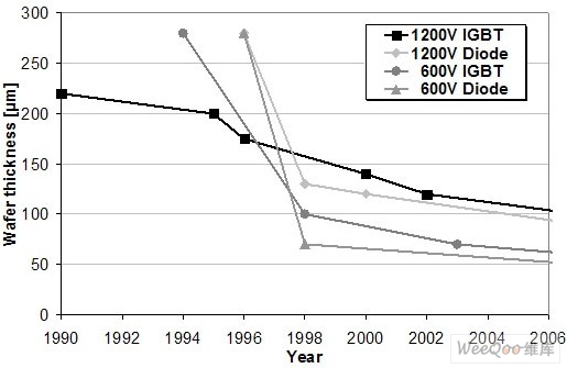 由于导通电压和关断损耗在很大程度上取决于晶圆的厚度,因此需要做更薄的IGBT。图4显示了英飞凌600/1,200VIGBT和EMCON二极管的晶圆厚度趋势。对于新型1,200VRC-IGBT而言,120um厚度晶圆将是标准工艺。这需要进行复杂的晶圆处理,包括用于正面和背面的特殊处理设备。将晶圆变薄可通过晶圆打磨和湿式化学蚀刻工艺实现。
