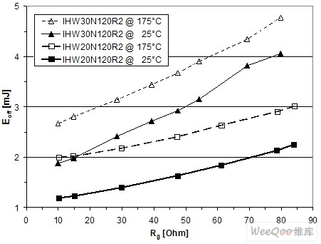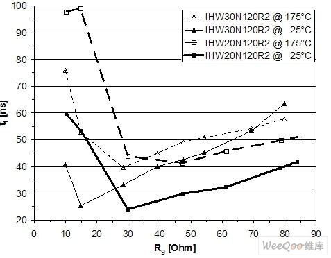 在典型饱和压降Vce(sat)=1.6V@25℃/1.85V@175℃和典型正向电压Vf=1.25V@175℃(额定电流)的条件下,功率损(特别是软开关应用的导通损耗)可大幅度降低。由IHW20N120R2的下降时间的切线可看出高速度—tf=24ns@25℃和Rg=30Ω(44ns@175℃)。IHW30120R2在下降时间方面是最为出色的:tf=33ns@25℃,Rg=30Ω;tf=40ns@175℃。(在硬开关条件下测量,参见带有Eoff曲线的图6和图7)。[page]