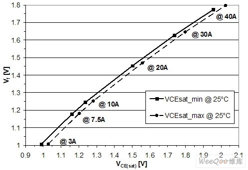 图7和图8显示了最新一代RC2-IGBT(IHW20N120R2)的超低饱和压降Vce(sat)和正向电压Vf。图8显示了1,000片该器件在室温和不同电流条件下的最低和最高饱和压降的曲线图,图9显示了它们在不同温度和20A额定电流条件下的饱和压降曲线图。