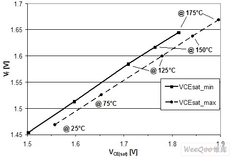 图8:室温和不同电流条件下IHW20N120R2的饱和压降与Vf的关系
