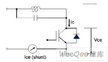 为了测量IGBT的集电极电流Ice,应在发射极和地之间使用超低阻值的取样电阻器。图11为Vce和Ic的波形(搪瓷烧锅负载)。工作频率为29.1kHz,LC电路在谐振范围之外(电磁炉的温度模式为50℃)。