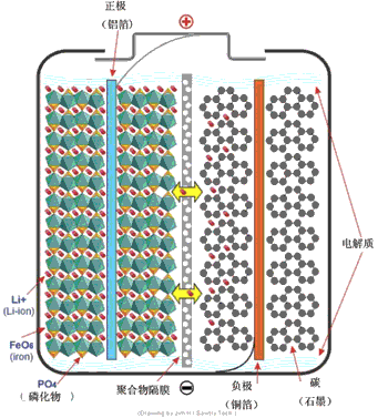 LiFePO4电池的内部结构如图1所示。左边是橄榄石结构的LiFePO4作为电池的正极,由铝箔与电池正极连接,中间是聚合物的隔膜,它把正极与负极隔开,但锂离子Li+可以通过而电子e-不能通过,右边是由碳(石墨)组成的电池负极,由铜箔与电池的负极连接。电池的上下端之间是电池的电解质,电池由金属外壳密闭封装。