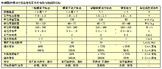 磷酸铁锂动力电池主要性能列于表1。为了与其他可充电电池的相比较,也在表中列出其他种类可充电电池性能。这里要说明的是,不同工厂生产的磷酸铁锂动力电池在各项性能参数上会有一些差别;另外,有一些电池性能未列入,如电池内阻、自放电率、充放电温度等。