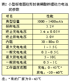 磷酸铁锂动力电池的容量有较大差别,可以分成三类:小型的零点几到几毫安时、中型的几十毫安时、大型的几百毫安时。不同类型电池的同类参数也有一些差异。这里再介绍一种目前应用较广的小型标准圆柱形封装的磷酸铁锂动力电池的参数。其外廓尺寸:直径为18mm、高650mm(型号为18650),其参数性能如表2所示。