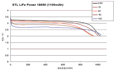 一种型号为STL18650的磷酸铁锂动力电池(容量为1100mAh)在不同的放电率时其放电特性如图2所示。最小的放电率为0.5C,最大的放电率为10C,五种不同的放电率形成一组放电曲线。由图2中可看出,不管哪一种放电率,其放电过程中电压是很平坦的(即放电电压平稳,基本保持不变),只有快到终止放电电压时,曲线才向下弯曲(放电量达到800mAh以后才出现向下弯曲)。在0.5~10C的放电率范围内,输出电压大部分在2.7~3.2V范围内变化。这说明该电池有很好的放电特性。