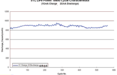 STL18650的充放电循环寿命曲线如图4所示。其充放电循环的条件是:以1C充电率充电,以2C放电率放电,历经570次充放电循环。从图4的特性曲线可看出,在经过570次充放电循环,其放电容量未变,说明该电池有很高的寿命。