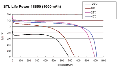 容量为1000mAh的STL18650在不同的温度条件下(从-20~+40℃)的放电曲线如图3所示。如果在23℃时放电容量为100%,则在0℃时的放电容量降为78%,而在-20℃时降到65%,在+40℃放电时其放电容量略大于100%。