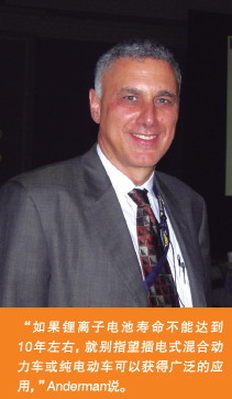 “如果锂离子电池寿命不能达到10年左右,就别指望插电式混合动力车或纯电动车可以获得广泛的应用,”Anderman说。