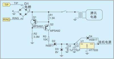 在挂机状态下有多种馈电方式,恒流源配合线性稳压电路的馈电方式是常用的一种,图1给出了这种馈电方式的电路结构。在该电路中,电桥用来做极性?;?,其后的一个恒流源电路与通讯电路并接。电流大小基本由R1决定,约为300uA,这是为了在保证挂机电源供应的同时,不会因为漏电过大而导致交换机方误判电话终端故障。由于电流太小,所以无法使用效率更高的开关电源。通讯电路一般采用变压器耦合以消除对地的不平衡,但如果电路允许,也可采用通讯电路与电桥共地的连接方式来简化电路。