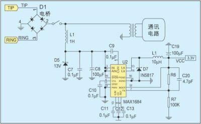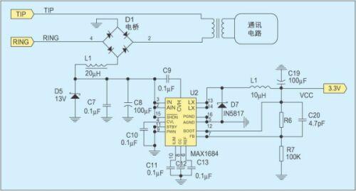 摘机馈电电路大致分为两类,馈电电路与通讯电路并联的属于并联馈电,馈电电路与通讯电路串联的属于串联馈电。图2是一种常用的并联馈电电路,大电感L1保证直流馈电不会影响交流信号。对于恶劣的线路状况,如5km长的用户线路,若不考虑通讯电路的影响,齐纳管D5上的电压最大为15V,功率可达340mW。当线路状况更加恶劣时,将齐纳管D5上的电压降低到13V,则可获得300mW左右的功率。利用MAXIM公司的开关频率为600KHz,效率可达95%的高效DC/DC转换器MAX1685,将这个电压转换成3.3V就可获得85mA的电源电流。