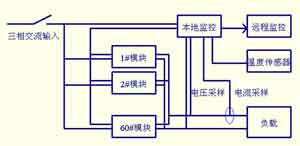 大功率电动汽车充电机的输入为额定线电压380V、50Hz的三相交流电,输出额定电压700V,额定电流600A。系统采用19"标准机架,结构紧凑、布局合理、外型美观大方。外型尺寸:高×宽×深为2200mm×600mm×600mm。采用60个??椴⒘扛瞿??0A/700V,模块尺寸:高×宽×深为133mm×425mm×270mm,15层4列,分四个柜体安放,四个柜体可分开运输,使用时紧凑左右排列?;芮懊?、后门均为双开门,方便检修。电源进线和汇流排输出位置均在底部输入。电源输入断路器及监控单元触摸屏安装在主机中间控制柜前部。充电机控制结构示意图如图2所示。