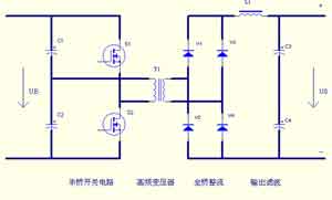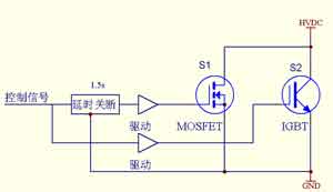 DC/DC功率变换器采用半桥电路拓扑,功率器件少,控制简单,可靠性高。如图5所示,采用MOSFET和IGBT并联技术,充分利用了MOSFET开关速度快和IGBT导通压降低的优点。在电路上采取措施,使得MOSFET的关断时间比IGBT延迟一定的时间,大大减小了IGBT的电流拖尾,降低了开关通态损耗,提高了效率和可靠性,使得半桥电路的输出功率可以实现7kW。其输出侧采用的整流方式有半波整流,中心抽头全波整流及全桥整流。由于输出电压较高,全桥整流对变压器利用率高,比较适合用于这种场合。