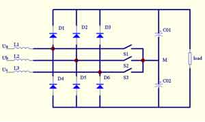 由于电动汽车充电机为非线性负荷,会产生谐波,对电网是一种污染。必须采取有效措施,如功率因数校正或无功补偿等技术,限制电动汽车充电机进入电网的总谐波量。为提高功率因数,降低输入电网谐波,采用有源功率因数校正电路,如图4所示。它采用三相三开关三电平BOOST电路,工作在连续模式,开关采用两个MOSFET组合成的双向开关。图中,开关S1,S2,S3是双向开关。由于电路的对称性,电容中点电位VM与电网中点的电位近似相同,因而通过双向开关S1、S2、S3可分别控制对应相上的电流??睾仙鲜倍杂ο嗌系牡缌鞣翟龃?,开关断开时对应桥臂上的二极管导通(电流为正时,上臂二极管导通;电流为负时,下臂二极管导通)。在输出电压的作用下Boost电感上的电流减小,从而实现对电流的控制。其控制电路采用三个控制芯片UC3854A,相电压通过三相隔离变压器向UC3854A提供同步信号和预校正信号,电流反馈采用霍尔电流互感器,分别控制三个开关,形成三个电流反馈内环和一个电压反馈外环的多闭环系统。该电路的优点在于结构简单,每相仅需一个功率开关。具有三电平特性谐波电流小,开关管电压电流应力小。不需要中线,无三次谐波,满载时功率因数很高??赜απ?,关断压降低,开关损耗低,共模EMI低。