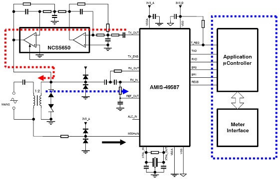 蓝色箭头表示接收路径。变压器从电力线耦合过来的信号经AMIS-49587内置放大器构成的低通滤波器由内部ARM进行FSK解调分析。图中黑色箭头是50Hz的过零检测信号引脚。系统依靠这个信号进行同步定时。图中蓝色虚线内是电表内的应用处理器,负责应用层处理通信及计量。