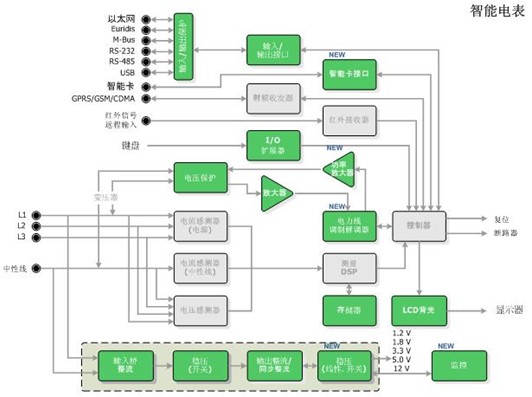 安森美半导体应用于智能电表的完整解决方案安森美半导体应用于智能电表的方案包含一系列标准产品、专用标准产品(ASSP)及专用集成电路(ASIC),可以提供智能电表的4种基本功能,包括:电源/电源管理、计量、寄存及通信,具体产品包括功率因数控制器、交流-直流(AC-DC)控制器、直流-直流(DC-DC)控制器、稳压器,MOSFET、整流器、三端双向可控硅开关元件(TRIAC),PLC调制解调器、线路驱动器及信号放大器,滤波、输入/输出(I/O)及数据保护,LCD背光驱动器,EEPROM存储器,及智能卡接口等。图2是由安森美半导体的多种器件(图中绿色部分)构成的智能电表应用。