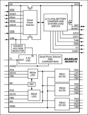 MAX8671XPMIC集成了DC/USB输入过压?;?、单节Li+电池充电器以及电池和外部电源之间负载切换所需的功率开关。集成开关和调节器可以省去外部MOSFET以及杂乱的电压检测器、电流检测电阻、比较器、定时器以及其他常见的用于电源监测和切换的分立元件。