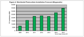 图4所示为iSuppli公司对2009-2015年总体PV安装量的估计与预测。