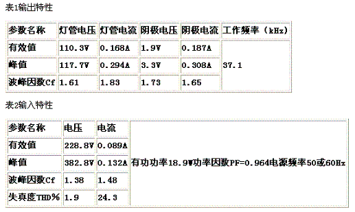 从图3、4和表3、4中有关数据可以看出,它的输入电流导通角为180°,没有死区,电压、电流基本同相位。PF>0.97,电流谐波在18%左右,Cf在1.6左右。由于电路简单,工作又比较可靠,所以比较适用于电子镇流器电路。