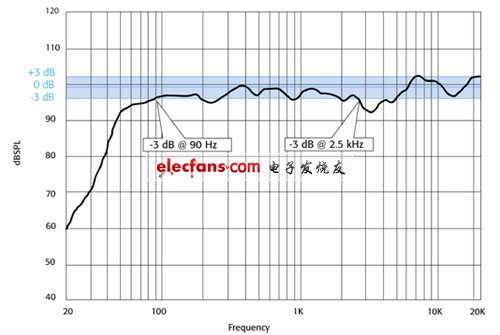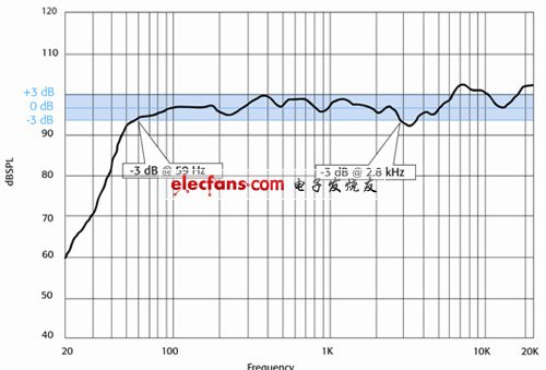 如果说+/-3dB所表示的是平坦特性,而不是频率响应范围,那么这个参数对频率特性而言还有什么意义?回答这个问题前我们可以看一下制造商在典型扬声器说明书上所标注的“+/-3dB频响。”
