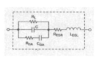 为了分析方便,在实际的分析应该中经常使用由串联等效电阻ESR、串联等效电感ESL、电容组成的RLC模型。因为对电容的高频特性影响最大的则是ESR和ESL,我们通常采用下图中简化的实际模型进行分析: