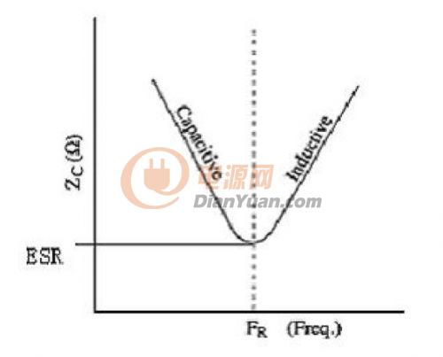 从上图,我们很清楚的看出:电容在整个频段,并非都是表现为电容的特性,而是在低频的情况(谐振频率以下),表现为电容性的器件,而当频率增加(超过谐振频率)的时候,它渐渐的表现为电感性的器件。也就是说它的阻抗随着频率的增加先减小后增大,等效阻抗的最小值发生在串联谐振频率时,这时候,电容的容抗和感抗正好抵消,表现为阻抗大小恰好等于寄生串联电阻ESR。