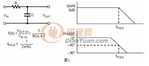 数学上,在传输方程式中,当分母为零时会产生一个极点。在图形上,当增益以20dB每十倍频的斜率开始递减时,在博得图上会产生一个极点。图1举例说明一个低通滤波器通常在系统中产生一个极点。其传输函数和博得图也一并给出。