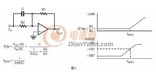 零点是频域范围内的传输函数当分子等于零时产生的。在博得图中,零点发生在增益以20dB每十倍频的斜率开始递增的点,并伴随有90度的相位超前。图2描述一个由高通滤波器电路引起的零点。