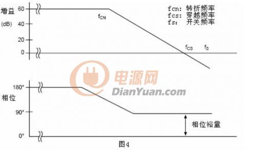 增益带宽是指单位增益时的频率,见图4,增益带宽就是穿越频率Fcs。最大穿越频率的主要限制因素是电源的开关频率。根据采样定理,如果采样频率小于2倍信号频率(更严谨一点的说法是应该小于2倍最大信号频率,译注),则被采样的信息就不能被完全读取。