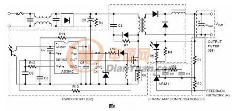 光耦的小信号传输函数是与光耦的电流传输比成比例的固定增益。R5(原文误为R6,式5一并改为R5,译注)是与光耦的二极管串联的限流电阻,并且是AS3842误差放大器的输出阻抗(此句应该理解为R5是这个AS3842开关电源电路中,误差放大器部分的输出阻抗,译注)。这一点在应用文档“SecondaryerroramplifierwiththeAS431”中有深入的阐述。从误差放大器的输出到AS3842的COMP脚的传输函数是: