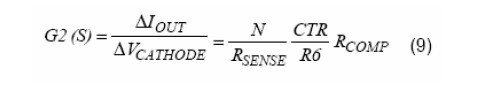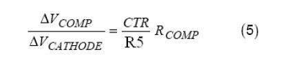 VCATHODE是AS431的阴极电压,也就是误差补偿放大器的输出电压。CTR是光耦的电流传输比。R5(原文为R6,译注)是与光耦的二极管串联的限流电阻。RCOMP是AS3842的COMP脚当其试图拉电流超过它的最大输出电流时的输出阻抗。