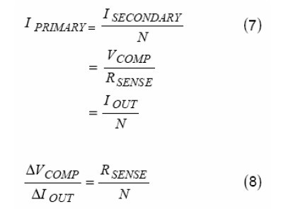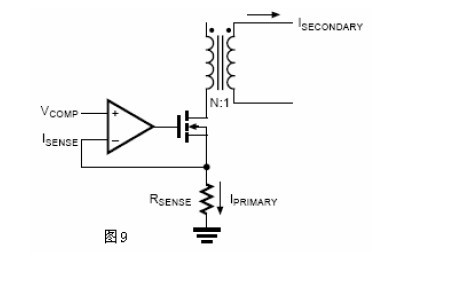 从ISECONDARY以后(见图9),副边电流或者说输出电流与主边电流成比例,把等式(4)重新排列表示出副边电流与VCOMP之间的关系。