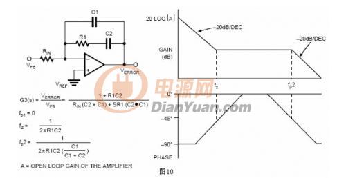 一旦输出滤波器和PWM电路部分的传输函数确定下来,然后可以设定误差放大器补偿网络以取得最优化的系统性能。图10例举出一个在低频时提供高的频率滚降和高增益的补偿方案。