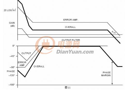 因为这是一个线性系统,可以用叠加的方法得到整个系统的传输函数。通过把整个环路各部分的增益和相位叠加起来,产生整个系统的博得图。通过放置补偿网络的极点和零点使系统的性能最优化。图11把各部分的博得图结合起来,负反馈系统的180度相移也加入进来了。