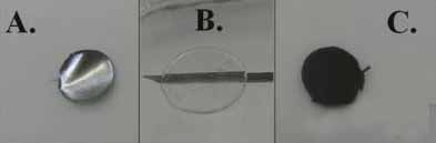 从左至右依次为:(A)锌阳极(直径1厘米),(B)EMIHSO4-聚乙烯醇隔膜(置于一个注射器针头上,显示厚度和透明度),(C)二氧化铅-碳阴极。