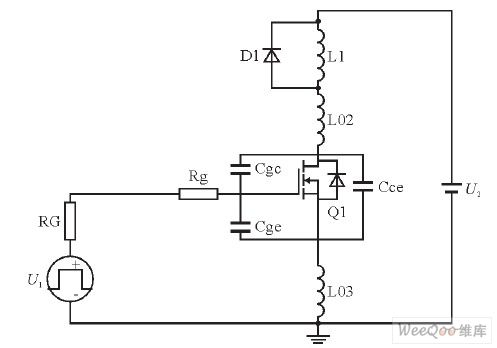 RG+Rg是IGBT的栅极电阻, L01、L02、L03是杂散电感(分布电感), Cgc、Cge、Cce是IGBT的极间电容, U1是驱动控制信号, U2为母线电压。