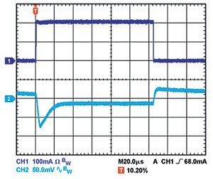 输出电容还会影响调节器对负载电流变化的响应。控制环路的大信号带宽有限,因此输出电容必须提供快速瞬变所需的大多数负载电流。当负载电流以500mA/μs的速率从1mA变为200mA时,1μF电容无法提供足够的电流,因而产生大约80mV的负载瞬态,如图1所示。当电容增加到10μF时,负载瞬态会降至约70mV,如图2所示。当输出电容再次增加并达到20μF时,调节器控制环路可进行跟踪,主动降低负载瞬态,如图3所示。这些示例都采用线性调节器ADP151,其输入和输出电压分别为5V和3.3V。