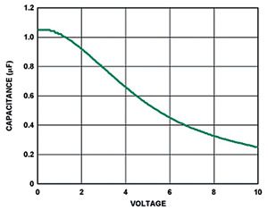 本例中,X5R电介质在–40~+85℃范围内的TVAR为15%;TOL为10%;CBIAS在1.8 V时为0.94μF,如图4所示。将这些值代入公式1,即可得出: