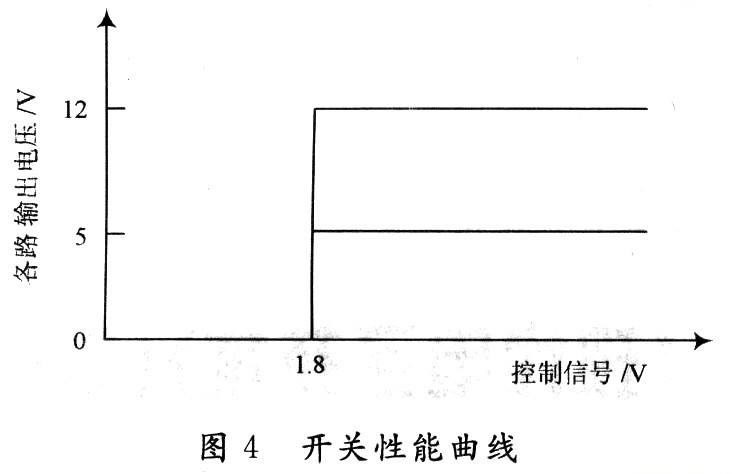 场效应管选择了增强型P沟道场效应管IRF9640和增强型N沟道场效应管VN2222L。以场效应管IRF9640作为开关管来控制电路的通和断,以场效应管VN2222L作为开关控制管来控制场效应管IRF9640的开和关。当控制信号输入端输入高电平时,开关电路导通;当控制信号输入端输入低电平时,开关电路断开。经过试验测得:当控制信号电压从0 V逐渐上升到1.8 V时开关导通;当电压从高电平(如3.3 V)逐渐下降到1.8 V时开关断开。此开关电路的性能如图4所示。