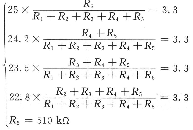 电池电压取样电阻网络是通过取样电阻的组合对电池的输出电压进行分压取样,各电阻端点对应的电池电压状态值分别为:R2对应22.8 V,R3对应23.5 V,R4对应24.2 V,R5对应25 V。当电池输出的电压值等于各个电阻设定的状态值时,则该电阻端取样电压为3.3 V;当电池输出的电压值大于各个电阻设定的状态值时,则该电阻端取样电压大于3.3 V;当电池输出的电压值小于各个电阻设定的状态值时,则该电阻端取样电压小于3.3 V。取样电阻R1,R2,R3,R4,R5的取值可由下面的方程组求得: