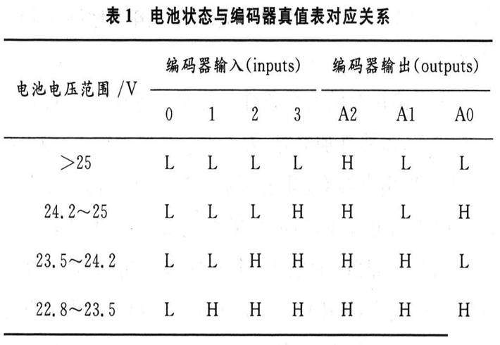 编码器74HCl48低电平有效,所以在比较器LMl39的后面又接了反相器74HC04,编码器输入/输出的二进制码(真值表)与电池电压的关系如表1所示。