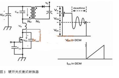 图3示出传统硬开关反激式转换器。在这种传统的间断模式反激式转换器 (DCM) 的停滞时间期间,寄生电容将与VDC周围的主要电感发生振荡。寄生电容上的电压会随振荡而变化,但始终具有相当大的数值。当下一个时钟周期的MOSFET 导通时间开始时,寄生电容 (COSS和CW) 会通过MOSFET放电,产生很大的电流尖峰。由于这个电流出现时MOSFET存在一个很大的电压,该电流尖峰因此会做成开关损耗。此外,电流尖峰含有大量的谐波含量,从而产生EMI。[page]