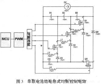 通过对以上各种均衡方法的特点相比较, 本文认为电感式均衡电路较适用于电动汽车电池组充电均衡. 电动汽车电池组具有大规模串联的特点, 因此, 本文在电感相邻均衡电路的基础上, 设计了大规模串联电池组的电感式均衡控制电路( 如图3) , 实现电池组内各电池之间的电量转移,达到均衡的目的.[page]