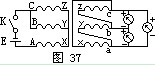 测单相变压器时,如图36所示,在初级线圈一侧拉入一个1.5伏的干电池,然后在次级线圈拉入一直流毫伏表。当合上开关K的一瞬间,表针朝正方向摆动(或拉开开关时表针向负方向摆),说明接电池正极一端是同极性,或叫同名端。测试三相变压器的极性和级别,多采用直流法进行。测试方法为:在初级线圈侧接上干电池和开关K,先在A端接电池正极,B端接电池负极,再在次级线圈a、b、c之间拉入三个毫伏表,如图37所示,