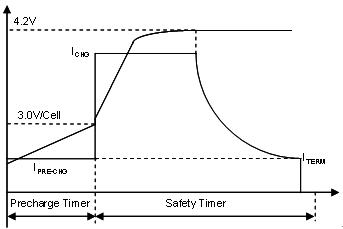预充电安全定时器可避免长时间给电量耗尽的电池充电。一般说来,电池单元电压达到 3.0 V,充电器就会进入 CC 阶段??焖俪涞绲缌魍ǔO薅ㄔ?0.5 至 1C 之间,以避免过热导致电池加速退化。应选择适当的速度,确保电池温度不超过 45oC,然后在快充速率下进行电池充电,直至电压达到调节限度(对基于 LiCoO2 的阴极而言通常是每单元 4.2 V)。充电器开始调节电池电压并进入 CV 阶段,这时充电电流会呈指数地下降至预定终止水平,结束电池充电。