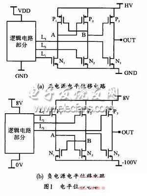 在正电源电平位移电路中,由于nLDMOS的源极为低压,所以可以通过低压逻辑部分来控制其开关状态,而源极为高压的pLDMOS则通过电平位移来控制。当高压驱动电压为8~-00V,低压逻辑部分工作电压为0~8V时,电平位移转换部分的电压分布本身没有改变,但是在和低压控制端接合时,与传统的正电源相比电平发生了改变,就需要重新设计低压逻辑的控制方式。此时,nLDMOS的源极为-100V电压,显然不能通过低压逻辑控制部分的0~8V电压来实现控制,而pLDMOS的源极为8V电源。因此采用了低压逻辑输出直接控制pLDMOS,而nLDMOS则通过电平位移来控制的方法,如图1(b)所示。