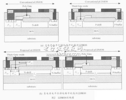 由于负电源供电的电平位移电路结构的改变,应用于正电源的常规nLDMOS和pLDMOS不能满足该电路结构要求。在正电源供电的电平位移电路中,由于pLDMOS的源端接高压电源,其栅源需要承受高压,所以pLDMOS采用了厚栅氧的结构,如图2(a)所示。在使用负电源的电平位移电路结构中(图1(b)),pLDMOS的源端为逻辑高压8V,栅端由低压逻辑0~8V电压控制,因此栅源不再承受高压。但是nLDMOS的源端为负电源的最低电位,其栅源需要承受高压,因此高压nLDMOS需要采用厚栅氧结构,如图2(b)所示。