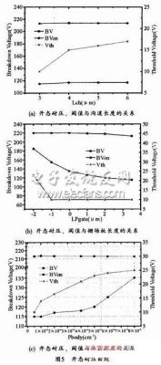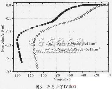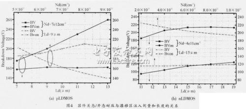 针对nLDMOS器件开态耐压低的问题,有针对性地仿真了沟道长度、多晶硅栅场板长度及体区浓度对开态耐压的影响。图5(a)为nLDMOS的关态耐压、开态耐压及阈值与沟道长度(Lch)的关系。可以看出沟道长度对器件的开态耐压和关态耐压影响很小。阈值随着沟道长度的增加而增加,这是由于采用横向双扩散形成沟道,所以随着沟道长度增加,p型体区的浓度越来越大,阈值也就越来越大。图5(b)为nLDMOS的关态耐压、开态耐压及阈值与多晶硅栅极场板长度(LPgate)的关系。在栅极场板较长时,其对阈值和关态耐压影响很小,当栅极场板缩短到多晶硅栅不能覆盖沟道时,器件的开态耐压大幅增加。这时阈值也迅速增加。虽然多晶硅栅不能完全覆盖沟道,但是由于开态时nLDMOS的栅漏电压差很大,所以仍然能够在表面形成反型层沟道。因此,大幅减短栅极场板能有效提高器件的开态耐压,但是同时也带来了器件不能有效开启的问题。图5(c)为nLDMOS的关态耐压、开态耐压及阈值与体区注入剂量(Pbody)的关系。可以看出增加体区的注入剂量对器件的耐压影响很小。但是随着注入剂量的增加,体区浓度增加,所以阈值就增加,同时器件的开态耐压也随之增加。当体区注入剂量达到5e14cm-2时,阈值增加缓慢,开态耐压却大幅增加,所以只能通过阈值上的牺牲来改善nLDMOS的开态击穿耐压。