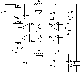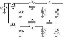 式中:Vc1、Vc2分别为C1和C2上电压的平均值;IL1、IL2分别是L-和L2流过电流的平均值,亦即两路输出电流平均值;R1及R2是滤波电感的等效串联电阻,当在工艺上设计并联电源每路输出电感基本上一样时,可以认为R1=R2。因此,要控制两路电流均流,即要求IL1=IL2,于是,只要控制Vc1=Vc2就行了。所以,电容C1及C2上的电压Vc1和Vc2可以代表两路电流IL1及IL2大小,可用来进行均流控制。