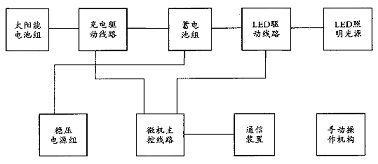 太阳能路灯微机监控系统由微机主控线路、太阳能电池板、蓄电池充放电器、蓄电池组、LED光源驱动和LED灯等几部分组成。系统组成结构如图1所示: