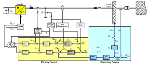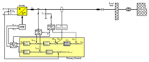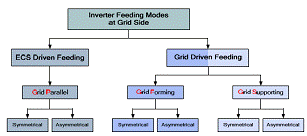 在ECS驱动馈电时,ECS决定了向电网传输的功率。如今,单台RESs逆变器典型地就在这种馈电方式下运行,并向电网注入全部可提供的功率。在电网驱动馈电时,不再是ECS,而是电网决定功率的传输。典型的,大多数常规大型电厂运行在这种方式下,同样,这种方式潜在的适合DERs和RESs系统,或者至少适合混合式电力系统。在ECS驱动馈电的情况下,逆变器控制方式被称作电网平行方式。第二种情况可以被两种不同的逆变器控制方式实现,分别是电网形成方式和电网支持方式。电网形成方式中逆变器的作用是建立和维持电网状态变量。电网支持方式中逆变器被用于平衡功率。它可以传输预先设定数量的功率,这个数量可以根据电力系统的需要或者高级控制运行得到的参考值进行调整。应用这个控制方式的逆变器例子如图3至图5的左侧所示。此外,这些基本有功功率调控器潜在的对二次电网控制的相互联系可以被类似的阐释。